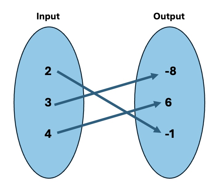 Mapping Notation (also known as an arrow diagram) is a way to show relationships visually between sets. For example, suppose you are given the following ordered pairs: \((3, -8), (4,6)\text{,}\) and \((2,-1)\text{.}\) Each of the \(x\)-values "map onto" a \(y\)-value and can be visualized in the following way: